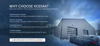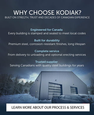 Kodiak commercial and retail steel buildings are engineered for strength, efficiency, and long-term performance. Each structure includes fully engineered framing, durable roof and wall cladding, and all standard trims required for a clean, professional finish. Built from 26-gauge steel with galvanized secondary framing and primed grey primary steel, these buildings are designed to withstand Canadian weather, high-traffic use, and the unique demands of commercial operations.
